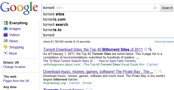 You can see that the suggested searches kick in again. The top suggested link is a guide to Torrent sites, the second is to the Pirate Bay. Which brings me to what I think is driving this. During the recent Pirate Bay trial, the point was made by the defence that what the Pirate Bay did was akin to what Google does – just a search facility. Remember torrent files are neither illegal in themselves nor contain any copyrighted material – they are just simple text files. I think Google is trying to balance the difficult tasks of ensuring that we believe it to be the most authoritative search engine on the net with (legal?) pressure to censor it’s output. If we, as users, no longer trust Google to return accurate results for a search then it’s main reason for being is doomed. (Interestingly Stack Overload’s Joel Spolsky made this point on the Guardian Tech Podcast, that Google has to return accurate searches above even it’s own commercial interest…) But if it does nothing in the face of legal actions, then it could be forced to comply with a ruling that achieves the same result. This I think is their balancing act response to this situation.
